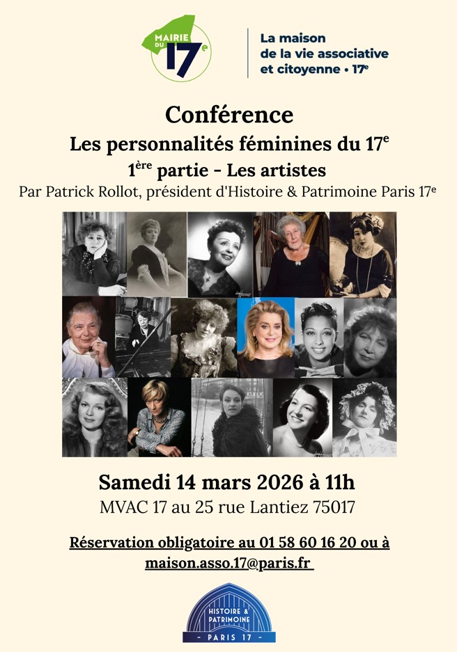 – Samedi 14 mars : CONFERENCE « Les personnalités féminines du 17e – 1ère partie : Les artistes », par Patrick Rollot, à l’occasion de la Journée internationale des droits des femmes (Maison de la Vie associative et citoyenne du 17e)