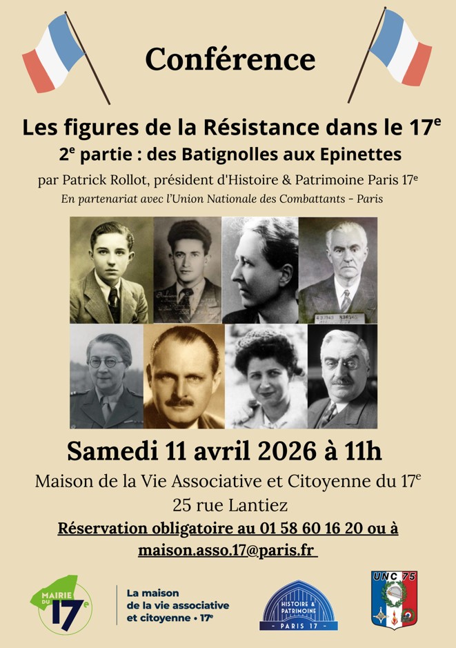 – Samedi 11 avril : CONFERENCE « Les figures de la Résistance dans le 17e » (2ème partie : des Batignolles aux Epinettes), par Patrick Rollot, en partenariat avec l’Union Nationale des Combattants – Paris (Maison de la Vie associative et citoyenne du 17e)