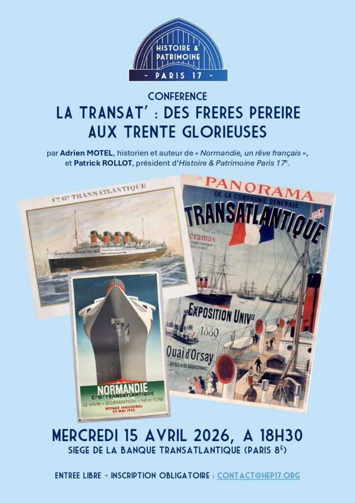 – Mercredi 15 avril : CONFERENCE « La Compagnie générale transatlantique, des frères Pereire aux Trente Glorieuses », par Adrien Motel (Siège de la Banque Transatlantique)